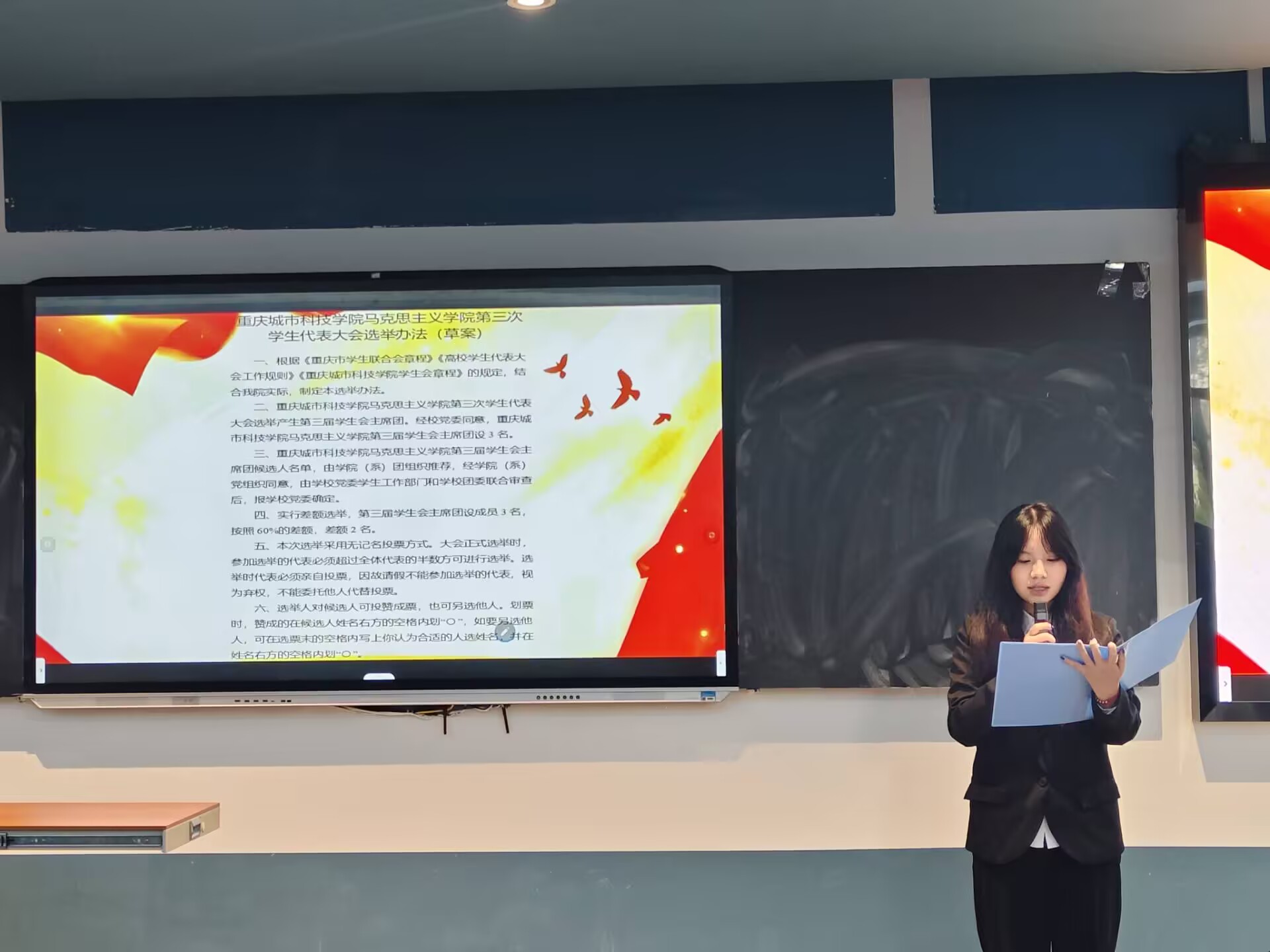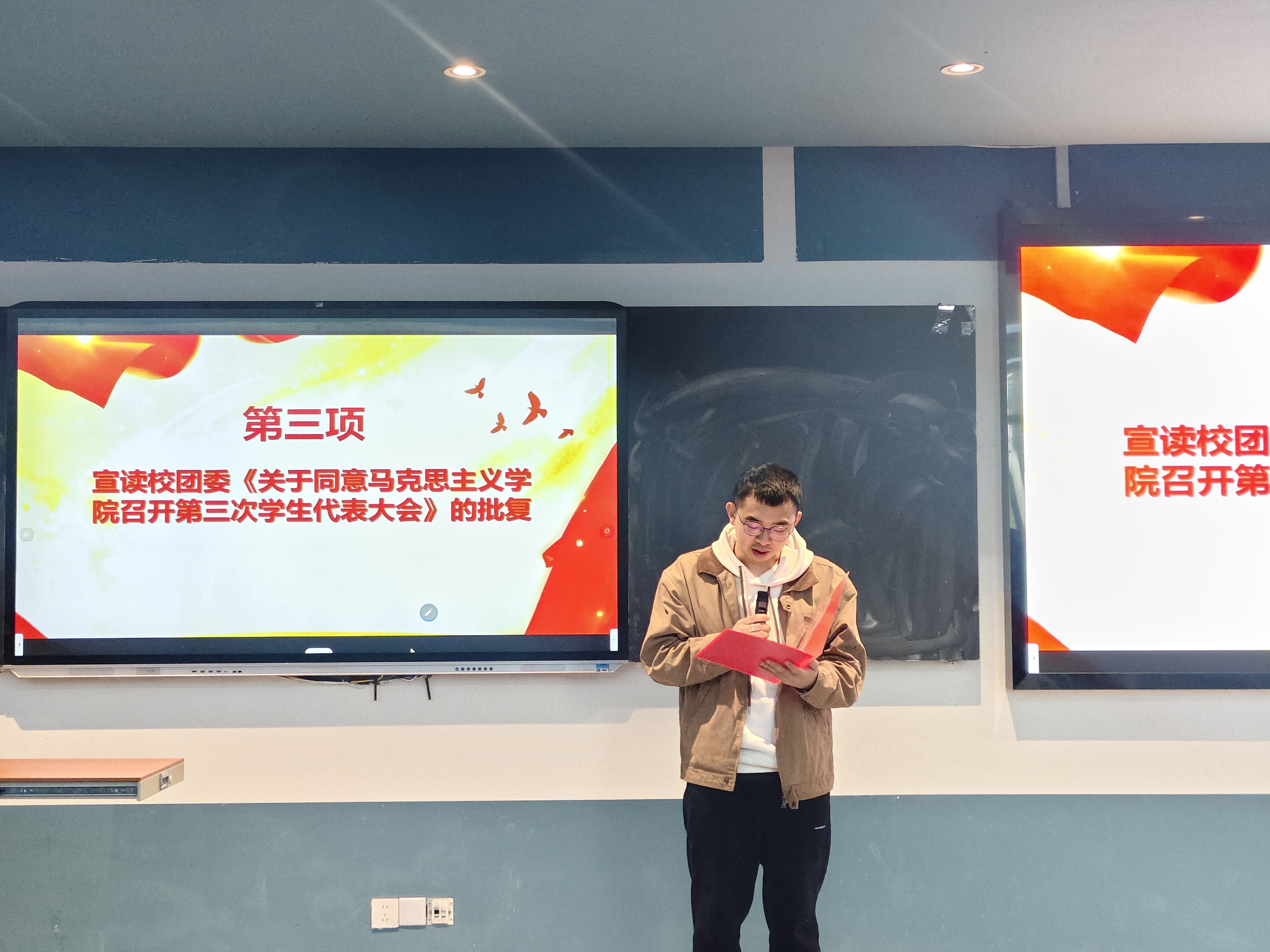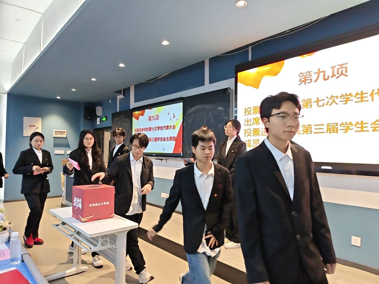 为回顾总结既往工作,全面加强学院学生组织建设、推动团学工作高质量发展,2025年10月22日,sjb世俱杯官方网站马克思主义学院第三次学生代表大会于第五教学楼102教室顺利召开。马克思主义学院院长段吉福、团总支书记王乙岚、团学指导老师吕瑞出席会议,本次大会由付宇同学主持。 会议伊始,全体参会人员起立奏唱中华人民共和国国歌。 大会第二项议程:马克思主义学院团学指导老师吕瑞宣读校团委《关于同意马克思主义学院召开第三次学生代表大会》的批复。 大会第三项议程:马克思主义学院团总支书记王乙岚宣读sjb世俱杯官方网站马克思主义学院党总支《关于马克思主义学院召开第三次学生代表大会的批复》,为大会提供了坚实的组织保障。 大会第四项议程:马克思主义学院第二届书记处主席团成员王梓灵作第二届学生会工作报告,全面回顾了过去一年学生会在思想引领、组织建设、服务同学等方面取得的显著成果,系统总结了学生会在实践探索中积累的宝贵经验。 大会第五项议程:学生骨干代表邱嘉怡宣读《sjb世俱杯官方网站马克思主义学院学生会章程(修订案)》,经全体代表审议后鼓掌通过。 大会第六项议程:学生骨干代表冉慧玲宣读《sjb世俱杯官方网站第三次学生代表大会选举办法(草案)》,经全体代表审议后鼓掌通过。 大会第七项议程:学生骨干代表陈凤烨宣读出席学校第七次学生代表大会候选代表名单、马克思主义学院第三届学生会主席团候选人名单。 大会第八项议程:参会代表秉持"公平、公正、公开"的原则,投下手中选票。经严格计票、监票程序,确定学校第七次学生代表大会代表、新一届主席团成员。 大会第九项议程:马克思主义学院院长段吉福在总结讲话中强调:“青年强,则国强。”当代青年正逢伟大时代,舞台广阔、前景光明,应当牢记这份殷切期望,将个人奋斗融入国家的宏伟征程。他对在场代表提出三点期望:一是要坚定信仰,筑牢思想根基,将马克思主义理论从课堂要求转化为内在追求;二是要做知行合一的实践者,锤炼过硬本领,主动将理论所学转化为服务社会的实际行动;三是要胸怀大局,勇担时代使命,把个人成长融入学院、学校和国家发展需要。 大会在激昂的《中国共产主义青年团团歌》声中圆满闭幕。 此次大会是一次承前启后、继往开来的青春盛会,充分展现了马克思主义学院学子昂扬向上的精神风貌。新一届团学组织必将不负韶华,团结带领全院同学为学院高质量发展贡献青春力量,在实现中华民族伟大复兴的征程中书写绚丽的青春篇章!(董艺/文 冉君临 刘佳怡 段楠兰/图 传媒中心 谢秋雨/编辑)