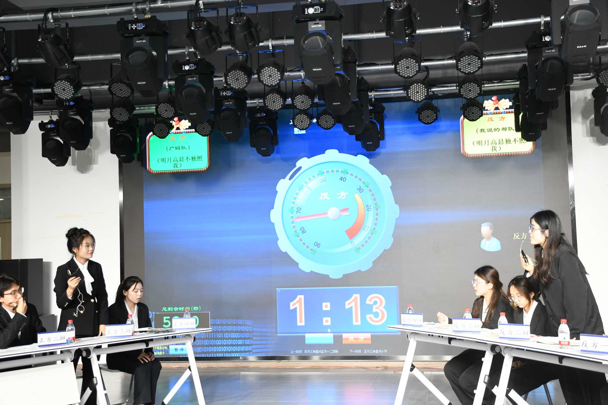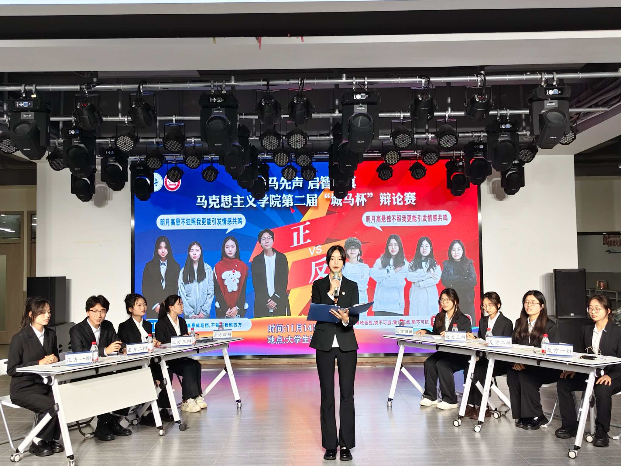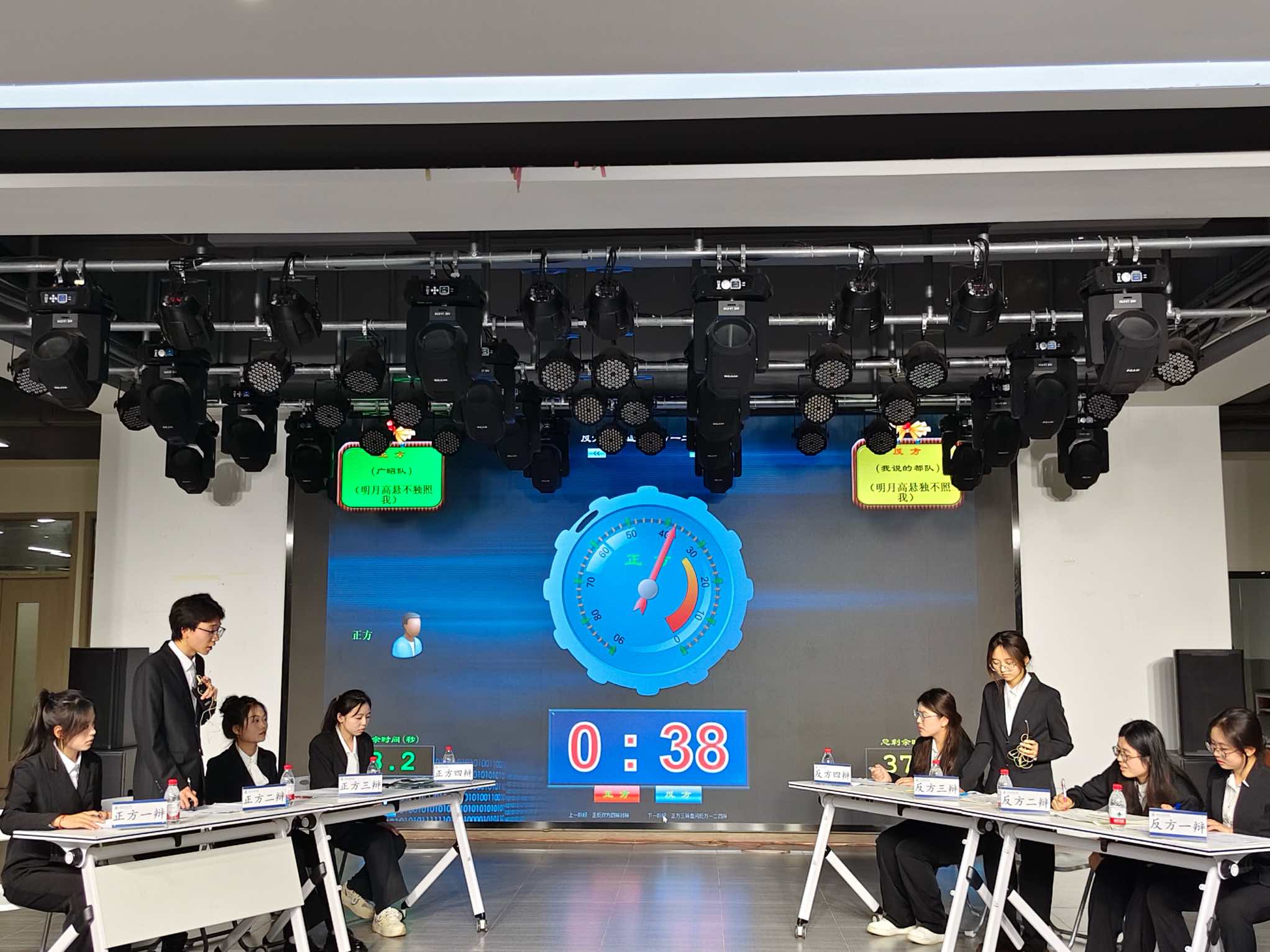 本届辩论赛“明月高悬不独照我/独不照我哪一立场更能引发情感共鸣辩题,正方“广昭队”与反方“我说的都队”展开激烈交锋。比赛采用标准赛制,设置开篇立论、质询交锋、自由辩论与总结陈词四个环节,并创新引入大众评委投票机制