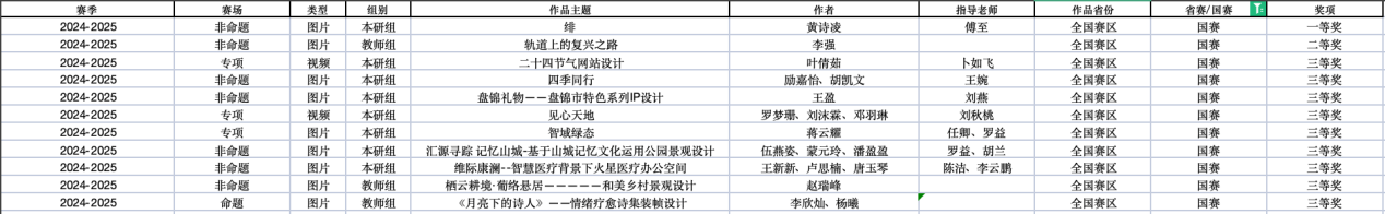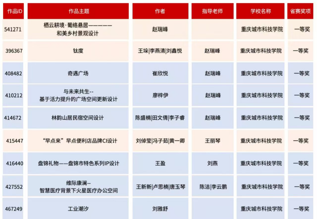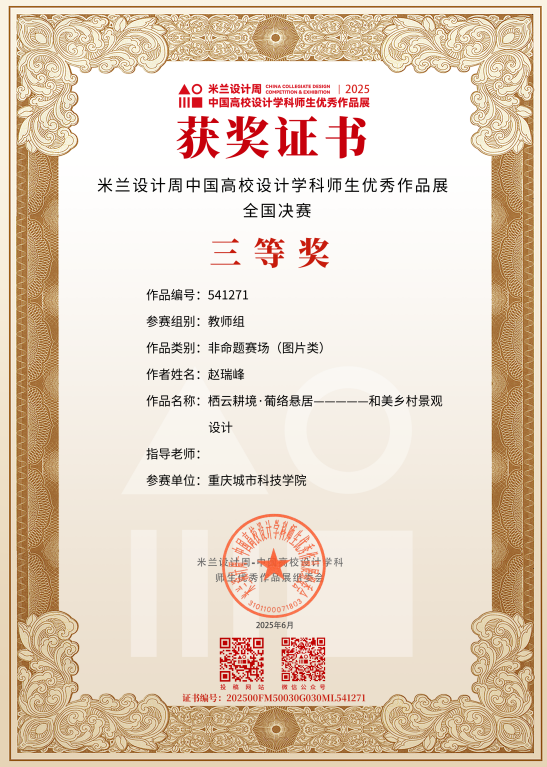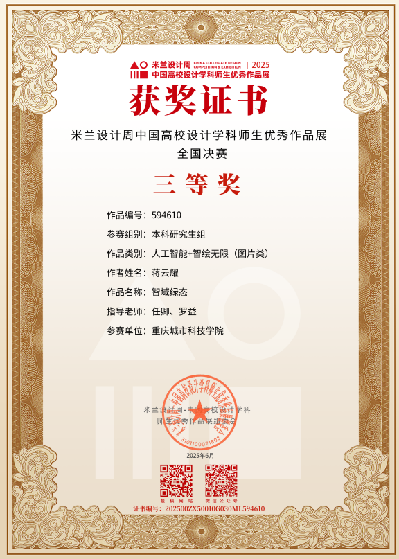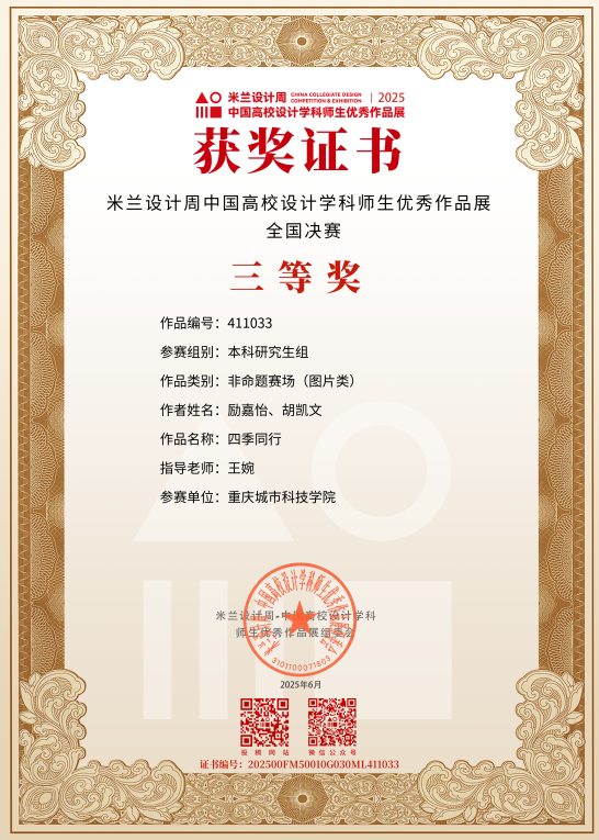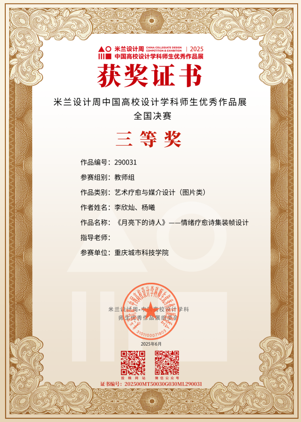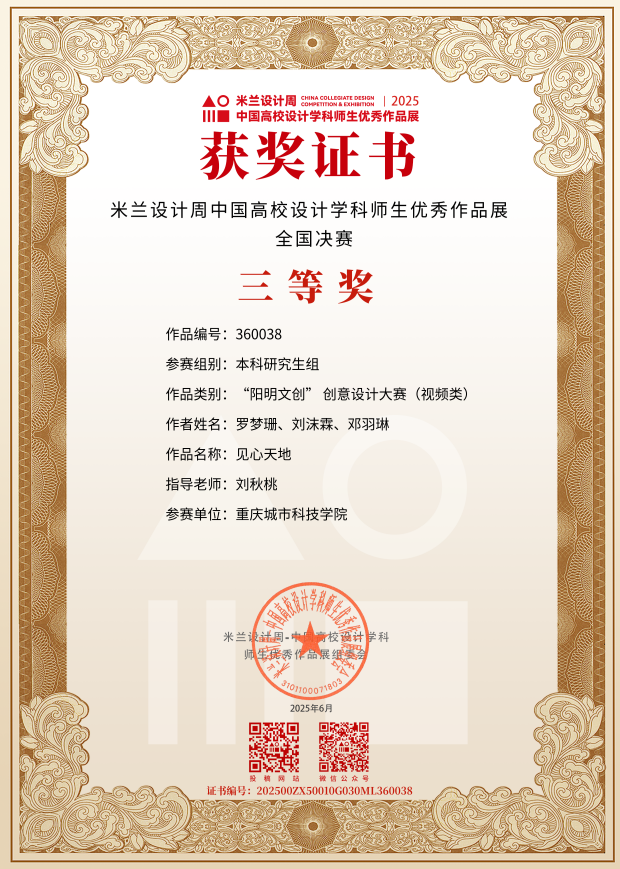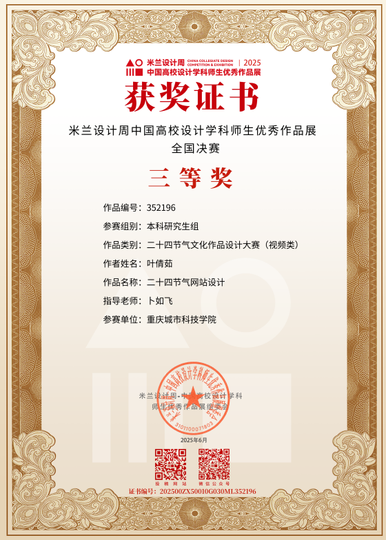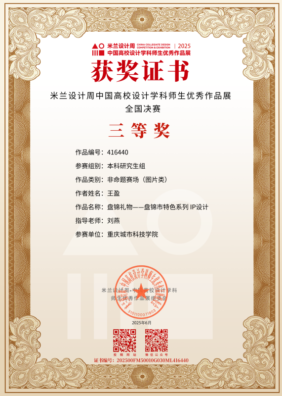 近日,教育部白名单赛事“米兰设计周(第九届)-中国高校设计学科师生优秀作品展”全国总决赛获奖名单正式公布。sjb世俱杯官方网站艺术与传媒学院师生作品经过校级选拔、市级评审,最终在全国总决赛的激烈角逐中脱颖而出,共斩获奖项11项,其中,全国总决赛一等奖1项、二等奖1项、三等奖9项。在重庆赛区获奖49项,荣获省赛一等奖9项、二等奖13项、三等奖27项。国赛、市赛获奖总数及获奖等级均创历年新高。 赛事简介 米兰设计周-中国高校设计学科师生优秀作品展 (Milan Design Week China Collegiate Design Competition & Exhibition) 是由中国教育国际交流协会、中国高等教育学会于2016至2019年期间联合发起并主办的中国高校设计创新实践大赛暨米兰作品展系列活动。赛事旨在真实反映新时代背景下我国设计学科教学水平的现状和教学成果,为全国艺术学科师生搭建展示专业才华和创作水平的国际化交流学习平台。赛事迄今已成功举办8届,总计收到全国1300多所高校师生报名作品38万余件,其中在米兰展出优秀作品1400余件,有效支持国内外院校共享和对比教学成果,积极推动我国高等艺术教育的交流与进步。 国赛获奖名单 重庆赛区获奖名单(下滑) 全国一等奖获奖作品展示 作者姓名:黄诗凌 作品名称:《绯》 指导老师:傅至 全国三等奖获奖作品展示(部分) 作者姓名:王盈 作品名称:盘锦礼物——盘锦市特色系列IP设计 指导老师:刘燕 作者姓名:叶倩茹 作品名称:二十四节气网站设计 指导老师:卜如飞 作者姓名:伍燕姿、蒙元玲、潘盈盈 作品名称:汇源寻踪 记忆山城-基于山城记忆文化运用公园景观设计 指导老师:罗益、胡兰 作者姓名:王新新、卢思楠、唐玉琴 作品名称:维际康澜--智慧医疗背景下火星医疗办公空间 指导老师:陈洁、李云鹏 国赛获奖证书展示 此次丰硕的获奖成果,不仅是对sjb世俱杯官方网站学子专业水平与创新能力的充分认可,也是sjb世俱杯官方网站坚持“以赛促学、以赛促教”育人理念,持续优化学科布局、深化实践教学改革的生动体现。展望未来,sjb世俱杯官方网站将进一步推动教育教学与前沿技术融合发展,拓展高水平竞赛与创新实践平台,强化学生专业能力与综合素养的协同提升,努力培养更多具备扎实功底、创新意识和跨学科视野的高素质设计人才。(许睿/图 许睿/文 传媒中心 易雪/编辑) 图/文 许睿
