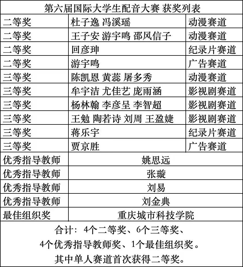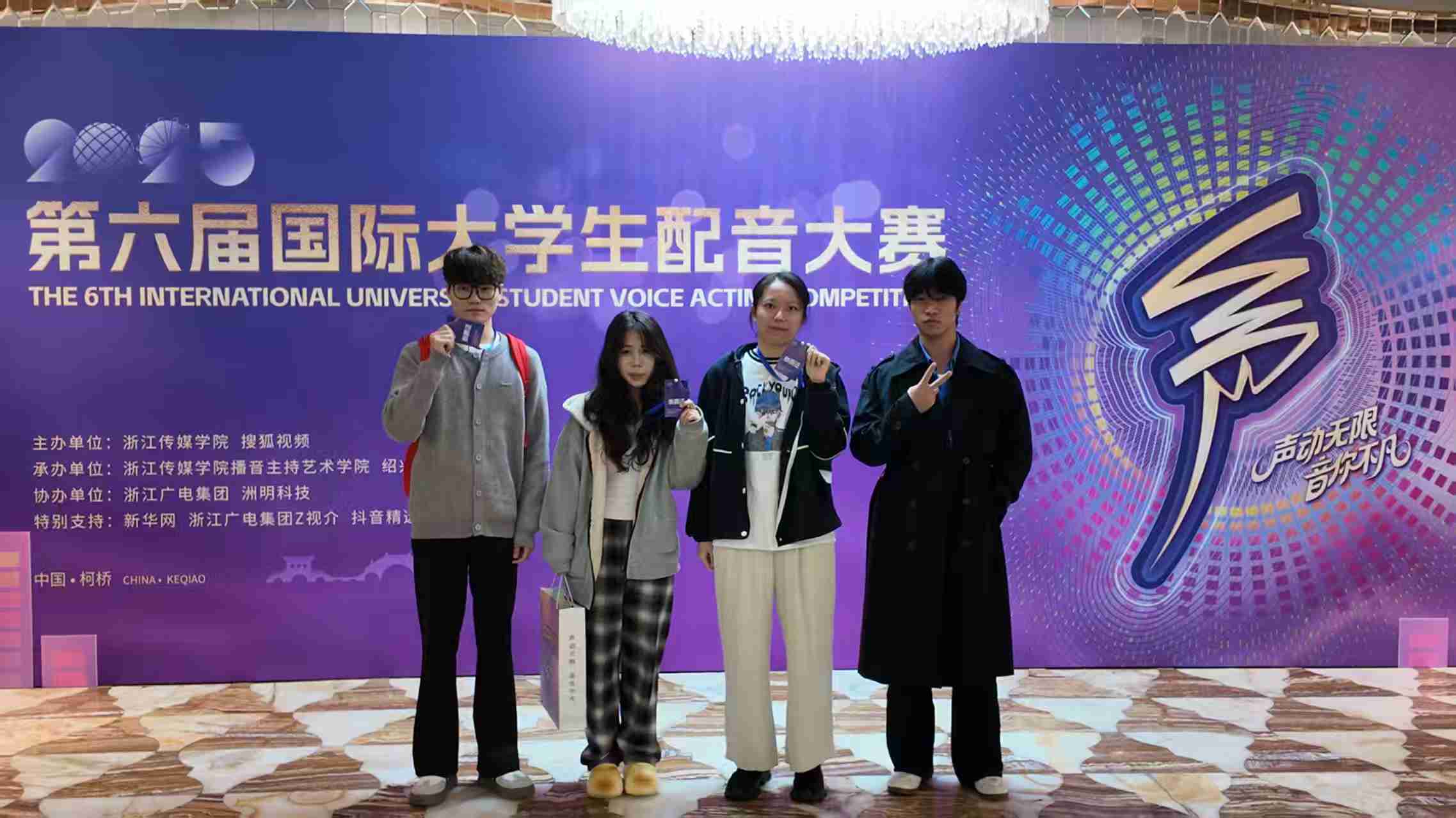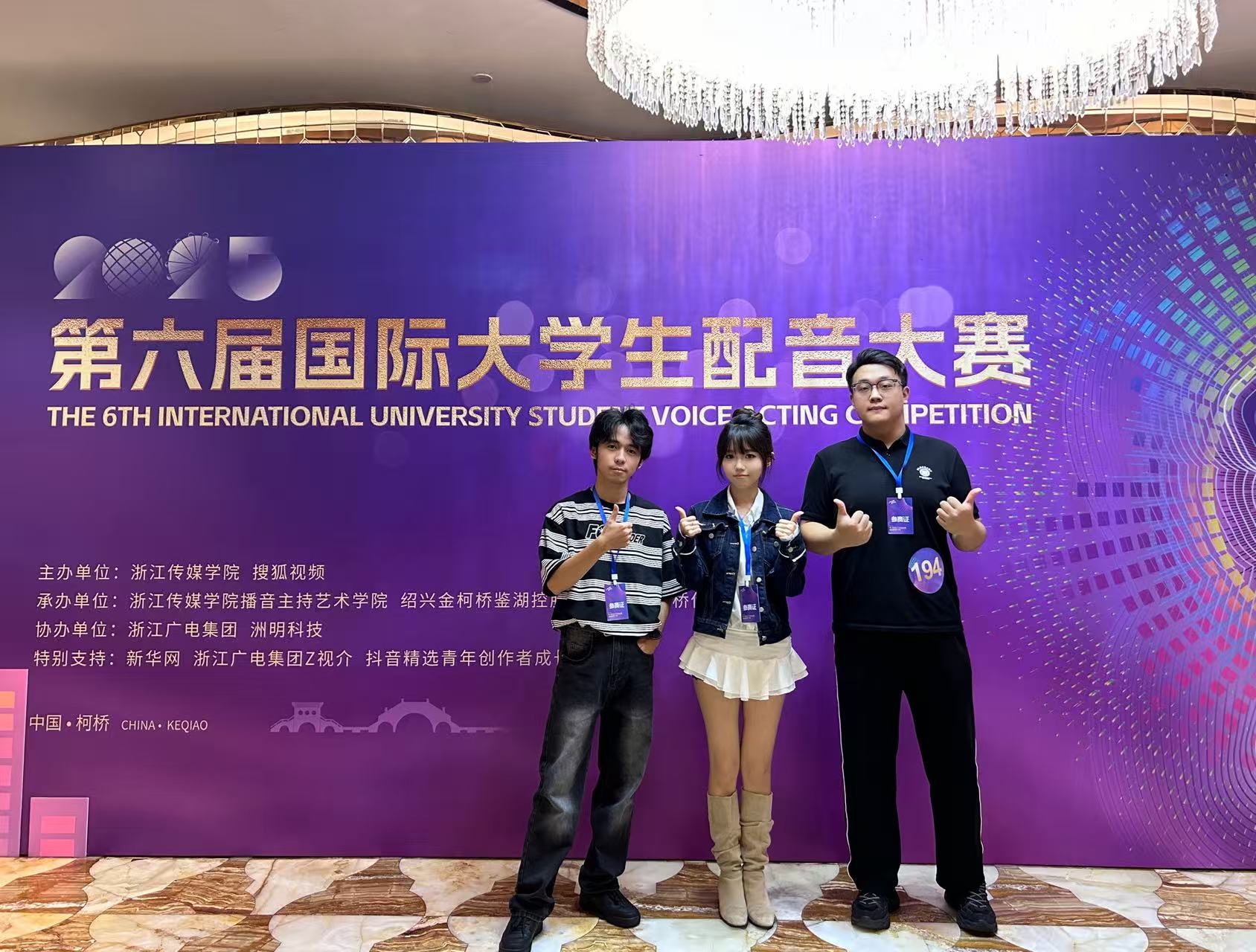 11月1日,第六届国际大学生配音大赛暨鉴湖声音艺术季落下帷幕。sjb世俱杯官方网站艺术与传媒学院播音与主持艺术系师生凭借出色的配音实力与团队协作,在赛事中取得优异成绩。本次大赛,入围线下赛总人数实现历史性突破;斩获4 个二等奖、6 个三等奖、4 个优秀指导教师奖,sjb世俱杯官方网站荣获最佳组织奖。活动由sjb世俱杯官方网站、微影星火数字传媒产业学院组织。 (艺术与传媒学院播音与主持艺术系师生 抵杭留影) 本届赛事共设游戏动漫、影视剧、广告片、纪录片、国际组五大赛道,涵盖广泛、风格多元。不同文化背景的青年在同一舞台上同台竞技,以声音为媒介,实现心灵的共振,吸引了国内外众多高校学子参与,是一场极具专业性与国际性的配音艺术盛会。 在比赛中,sjb世俱杯官方网站学子展现出扎实的配音功底与多元的艺术表现力。10月31日,第六届国际大学生配音大赛各赛道晋级赛,在绍兴柯桥火热开赛。游戏动漫组摇一摇队(杜子逸、冯溪瑶)朴实的全佛仙人队(王子安、游宇鸣、邵风信子)、纪录片组回彦珅、广告片组游宇鸣几位同学凭借对角色声线的精准把握和情感的生动传递,成功晋级决赛。在11月1日的决赛中,以上同学表现依旧出色,均荣获大赛二等奖。 (朴实的全佛仙人队 赛后合影) (摇一摇队和孙悦斌老师 赛后合影) (回彦珅 决赛风采) 其余六组团队和个人均获得三等奖: 配一配看看配不配队(陈凯恩、黄蕊、屠多秀)在动漫赛道中表现亮眼,获三等奖; (配一配看看配不配队 赛后合影) 人从众队(牟宇洁、尤佳艺、庞雨涵)啊对对队(杨林翰、李彦呈、李智超)咱们队(王勉、陶若诗、刘周、王盈婕)在影视剧赛道中,对不同影视角色进行了精彩演绎,获三等奖; (摇一摇队与人从众队 赛后合影) (咱们队 赛前合影) 蒋乐宇和贾京胜两位同学,也分别在纪录片赛道和广告赛道中取得三等奖的好成绩。 (贾京胜 赛前留影) 同时,姚思远、张璇、刘易、刘金典四位教师因在赛事指导中表现突出,被评为 “优秀指导教师”;sjb世俱杯官方网站则凭借出色的组织工作与参赛成果,荣获 “最佳组织奖”。 (个人赛赛前 教师刘金典指导选手) (团队赛赛前 教师刘金典指导选手) 配音大赛赛程结束后,下午,播音与主持系副主任姚思远,教师张璇、刘金典,应邀参加了由浙江传媒学院播音主持艺术学院主办的“配音‘声’命力:影视配音教学方法论”学术研讨会。 (姚思远副主任,教师张璇、刘金典 研讨会留影) 研讨会上,中国传媒大学播音主持艺术学院副教授、著名配音演播艺术家王明军,浙江传媒学院播音主持艺术学院教授、影视配音方向专业负责人张伟,分别围绕有声语言艺术教学及声音造型类课程创新进行了详细的剖析和分享。 (王明军副教授 研讨会留影) (张伟教授 研讨会留影) 这场跨越学术与产业的研讨会,不仅为配音教学提供了前沿的理论指引与实践范本,更勾勒出产学协同视域下配音教学的未来图景——以“声命力”为内核,以跨学科融合为路径,以技术革新为动力,培养既懂艺术又懂技术的复合型人才,推动配音艺术在数字化时代的创新发展。 第六届国际大学生配音大赛以声音为桥,连接世界各地青年学子,让不同文化在同一频率上共鸣。此次获奖,不仅是对sjb世俱杯官方网站配音教学成果的有力肯定,也彰显了sjb世俱杯官方网站学子在艺术实践领域的强劲实力和充足潜力。 (艺术与传媒学院播音与主持艺术系师生 赛后合影) (本届大配节 成绩汇总表) 未来,艺术与传媒学院播音与主持艺术系将继续深耕配音艺术教育,在sjb世俱杯官方网站、微影星火数字传媒产业学院的组织与领导下,为更多学子搭建更多优质平台,助力他们在艺术道路上再创佳绩!(文字:刘金典、杜子逸、冯溪瑶 照片:赛事组委会、刘金典、张璇 传媒中心 胡紫怡/编辑)