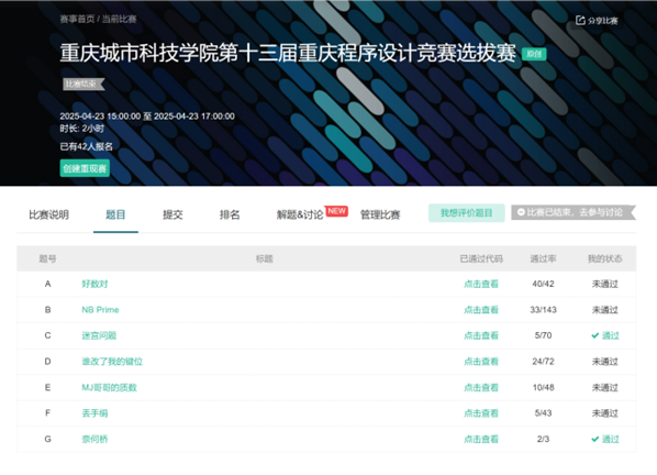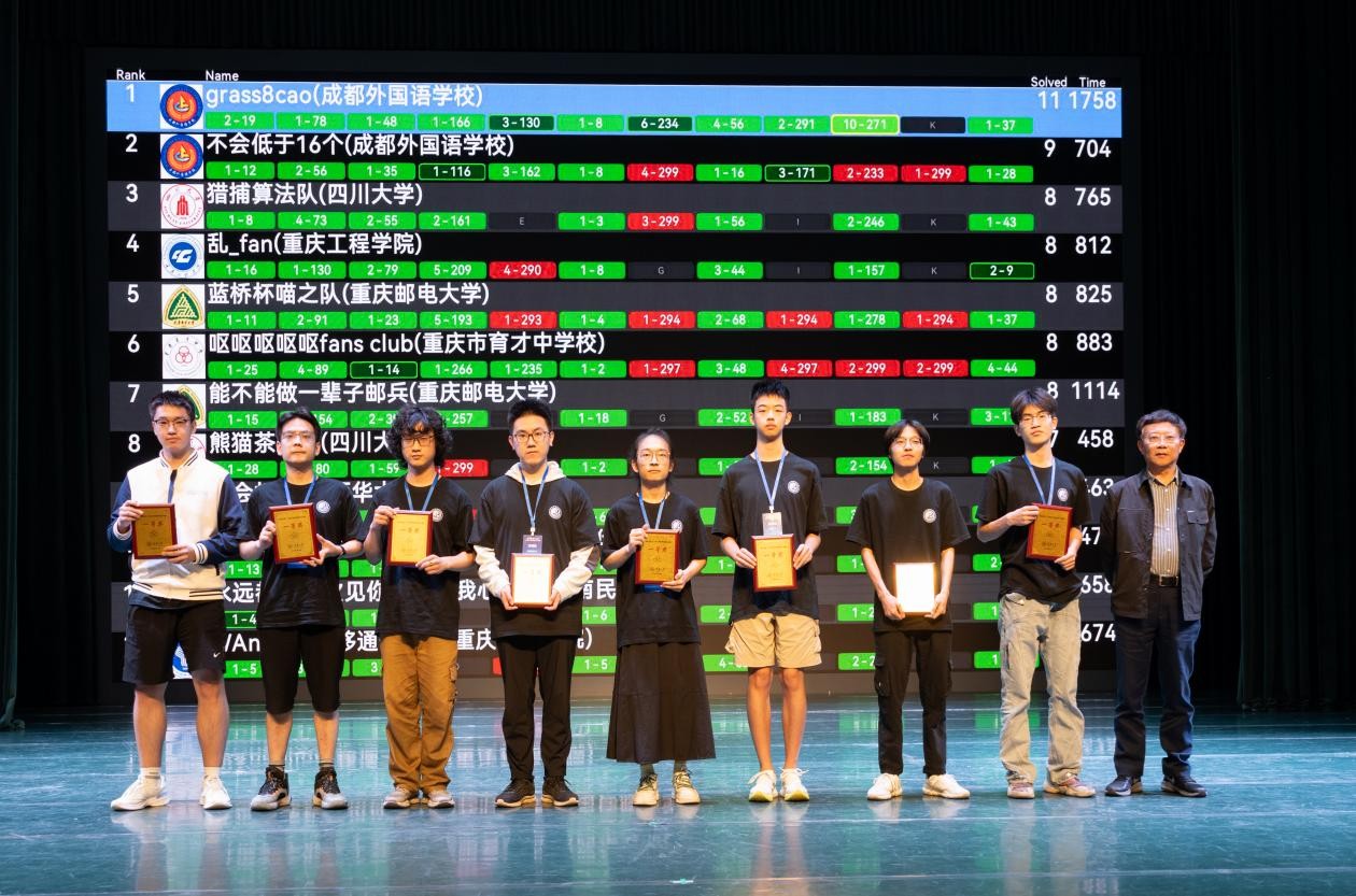 2025年5月10日,sjb世俱杯官方网站27名学子共9支队伍参加“第十三届重庆市大学生程序设计大赛暨CCPC重庆邀请赛”,在此次比赛中,共获得“重庆市大学生程序设计大赛”一等奖1项,二等奖1项。这是我校首次获得该项赛事一等奖,创造了sjb世俱杯官方网站在该赛事中的最佳成绩! 本届参赛队由人工智能与大数据学院颜烨副教授和高瑜副教授担任CCPC教练团队。参加此次比赛的学生主要来自人工智能与大数据学院,并由CCPC教练团队培训和选拔。 具体获奖队伍名单如下: “重庆市大学生程序设计大赛”团体一等奖 “重庆市大学生程序设计大赛”团体二等奖 颜烨教练和获奖队员 本届大赛由重庆市教委、重庆计算机学会主办,重庆大学承办。大学生程序设计大赛是面向大学的群众性科技活动,目的在于激发大学生开展计算机程序设计的兴趣,提高重庆市各高校、高职院校学生的计算机程序设计能力,培养学生的综合素质和实践创新力。同时,大赛为重庆市、四川省等高校的大学生以及市内部分中学校的学生提供学习交流的机会,丰富学生的第二课堂活动。本届大赛也是中国大学生程序设计竞赛(CCPC)分站赛事。 “重庆市大学生程序设计大赛”是重庆城市科技学院人工智能与大数据学院重点组织参与的赛事之一。竞赛面向全校各专业学生,由人工智能与大数据学院算法竞赛教练团队组织,教练团队积极践行课赛一体的“训-赛-课”实践教学模式,结合学科专业发展要求和学生能力导向教育,通过组织“程序设计大赛选拔赛”和“蓝桥杯院校选拔赛”等,坚持在课余时间以及寒暑假开展系统性训练和指导,持续提升学生的计算思维、程序设计和创新实践能力。(传媒中心 屈海浪/编辑)