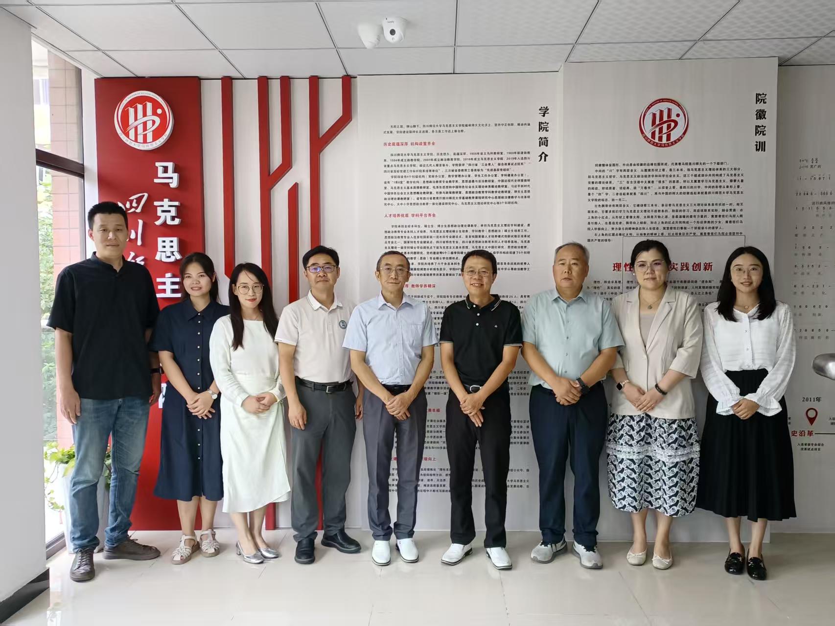 2025年9月25日,马克思主义学院院长段吉福、副院长张沙沙、思政系主任柳建国等一行7人,赴四川师范大学马克思主义学院进行调研交流,旨在学习借鉴兄弟院校在学科建设、专业人才培养、教科研建设等方面的先进经验,进一步增强校际合作与联系。 交流期间,双方就共同关心的话题进行了深入探讨。首先,四川师范学院马院院长戴剑飞结合对当前思政专业发展趋势的认识,介绍了四川师范学院马克思主义学院在学科发展规划、思政课教学改革创新等方面的举措与成效。 思想政治教育专业系主任黄雪垠分享了四川师范学院马克思主义学院在“微格”特色教学模式、人才培养模式探索、课程体系构建等具体做法。 段吉福院长代表学院对四川师范学院马克思主义学院的经验分享表示衷心感谢,他表示,四川师范学院马克思主义学院在诸多领域形成了鲜明特色,取得了显著成绩,其经验对马克思主义学院具有重要的启发和借鉴意义。 副院长张沙沙、思政系主任柳建国和副主任张峻铭分别对马克思主义学院思政课、专业课建设情况、人才培养方案修订等方面的具体做法进行了介绍。 会上,双方与会人员还就思政课实践教学、教科研项目联合攻关、学术资源共享等具体问题交换了意见。双方均表示,希望以此次调研为契机,建立更加紧密的联系,在未来开展更多层次、更多形式的交流与合作,相互促进,共同提升办学水平和核心竞争力。 会后,在四川师范学院马克思主义学院副院长付恒的陪同下,段院长一行对四川师范学院马克思主义学院进行了参观,学习了四川师范学院马克思主义学院院的“三读”、“三味”、“三能”、“三星”等品牌特色。 ( 马克思主义学院 图/文 传媒中心熊素平/编辑)