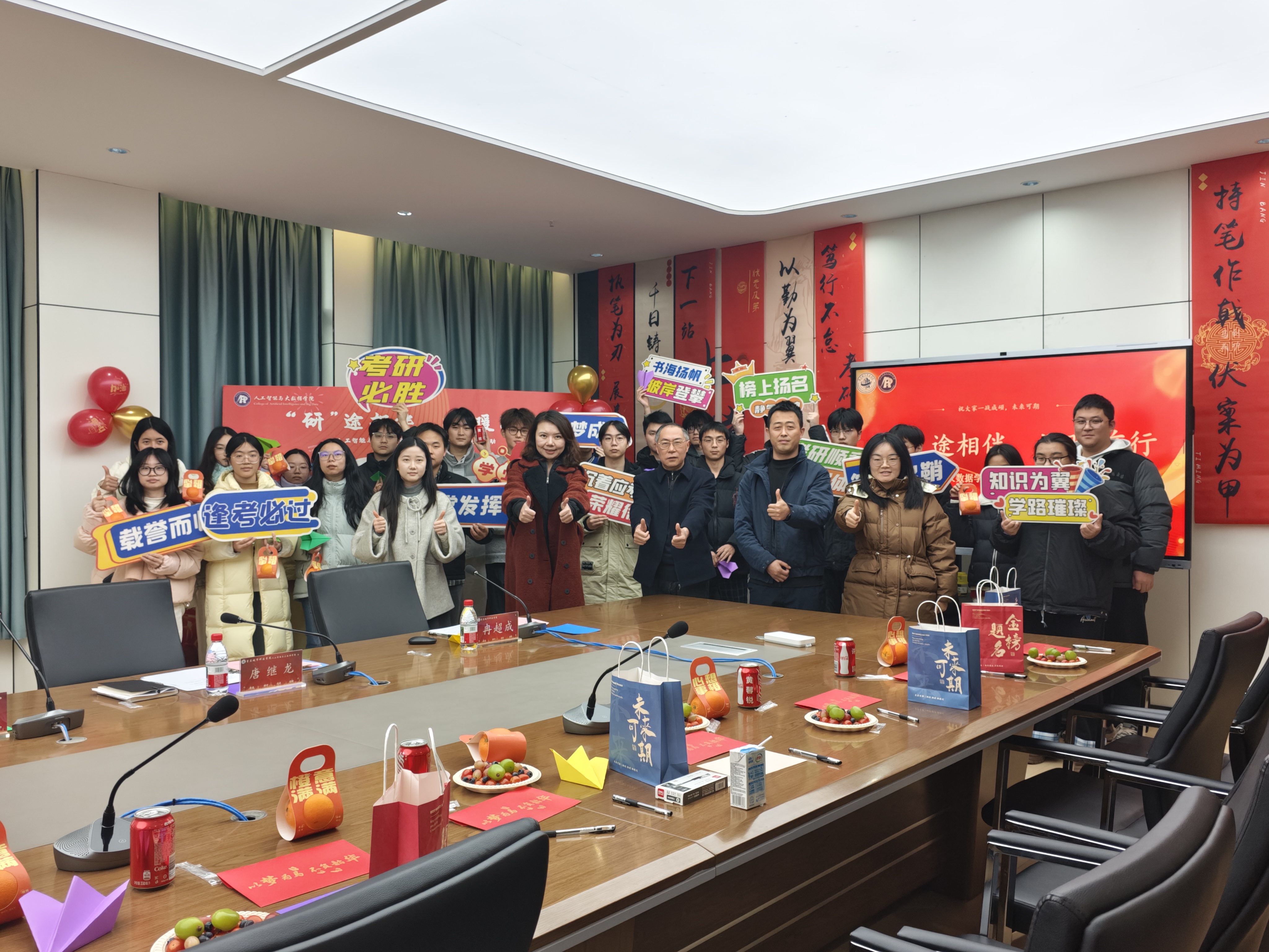 护航青年学子考研逐梦之路,人工智能与大数据学院在厚德楼705会议室隆重举行“‘研’途相伴,温暖同行”考研慰问活动,人工智能与大数据学院院长谢显中、行政院长万毅、党总支副书记唐继龙、毕业班辅导员冉超成、尹琳惠与考研学子代表齐聚一堂。