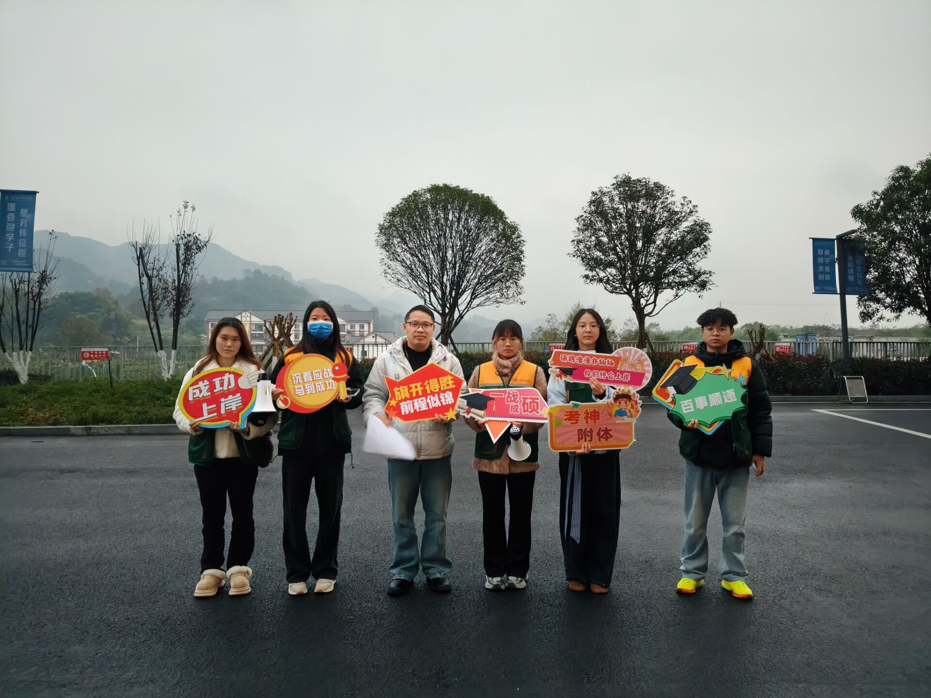 为传递学院对考研学子的深切关怀,人工智能与大数据学院党建工作站指导老师莫帮洋带领大二大三学生志愿者,他们手持精心制作的加油助威KT板。